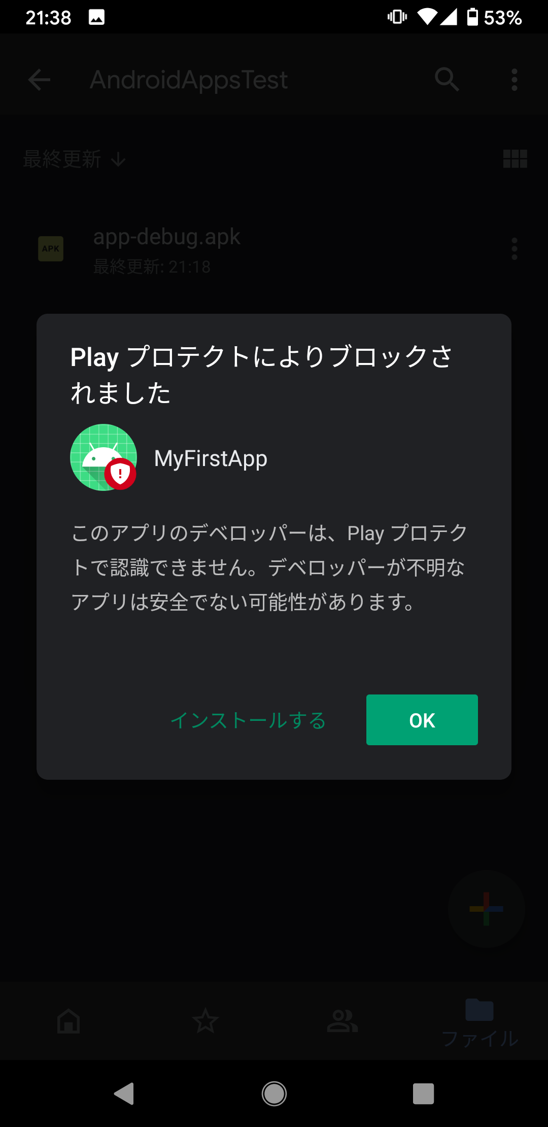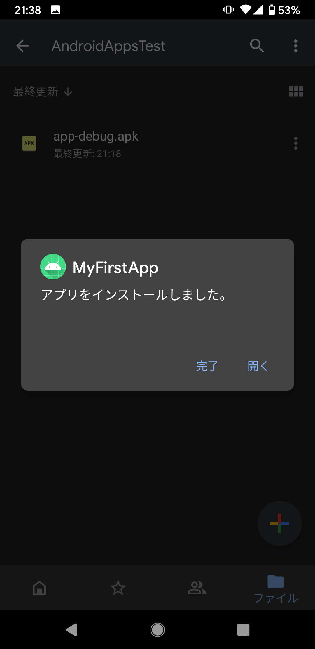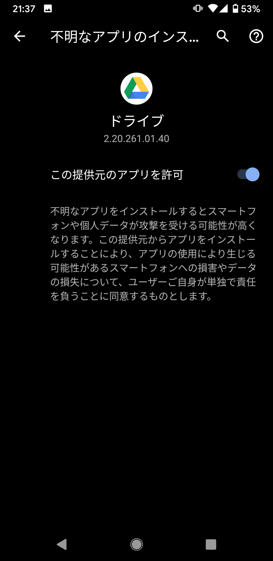 あとはこのAPKファイルをAndroidの実機で開くだけです。どうやってこのファイルをAndroidの実機に送るかですが、私はGoogle Driveに置きました。