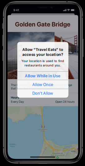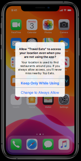 2.アプリ起動時の位置情報サービスの利用許可を求めるダイアログ(↓の画像参照)から「常に許可」(Always Allow)という選択肢がなくなる