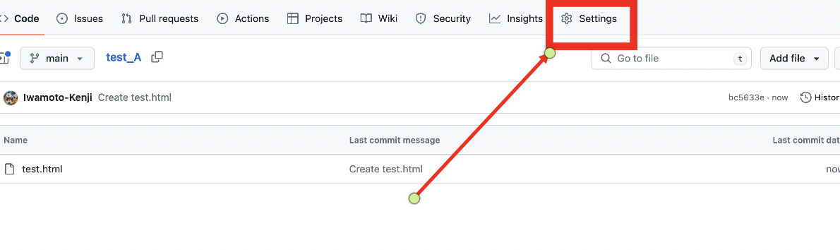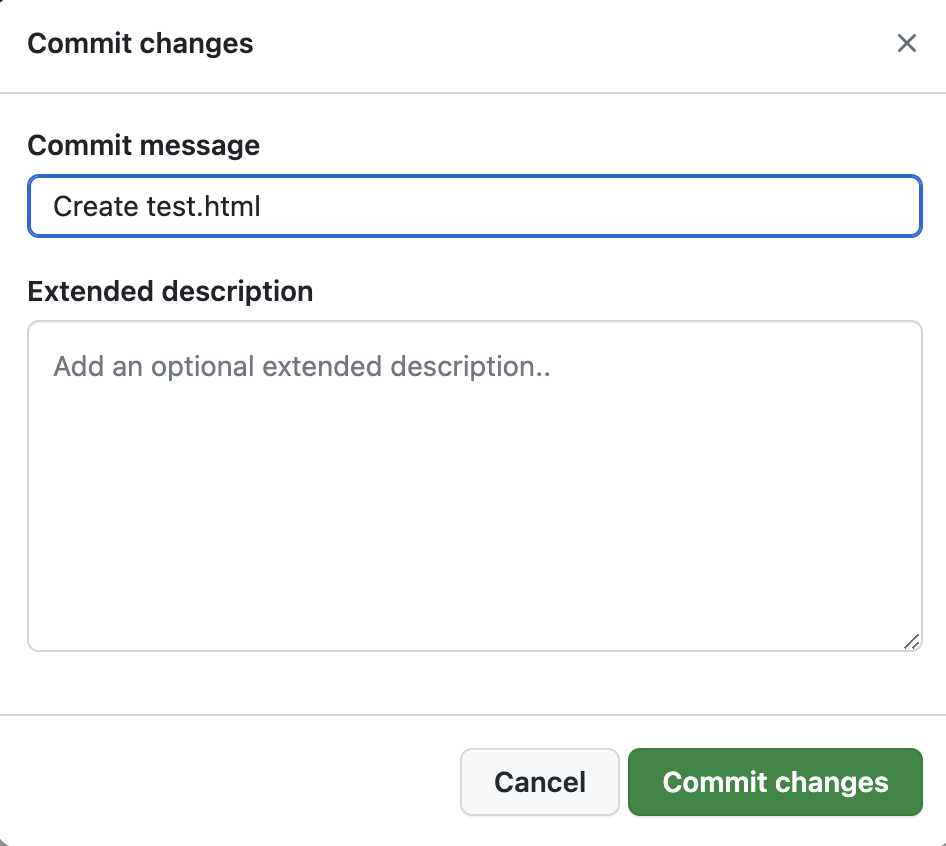 例えばファイル名に「test.html」と入力し、ファイル内容を「test」とだけ入力したファイルを作成します。そして「Commit changes...」ボタンを押下します。