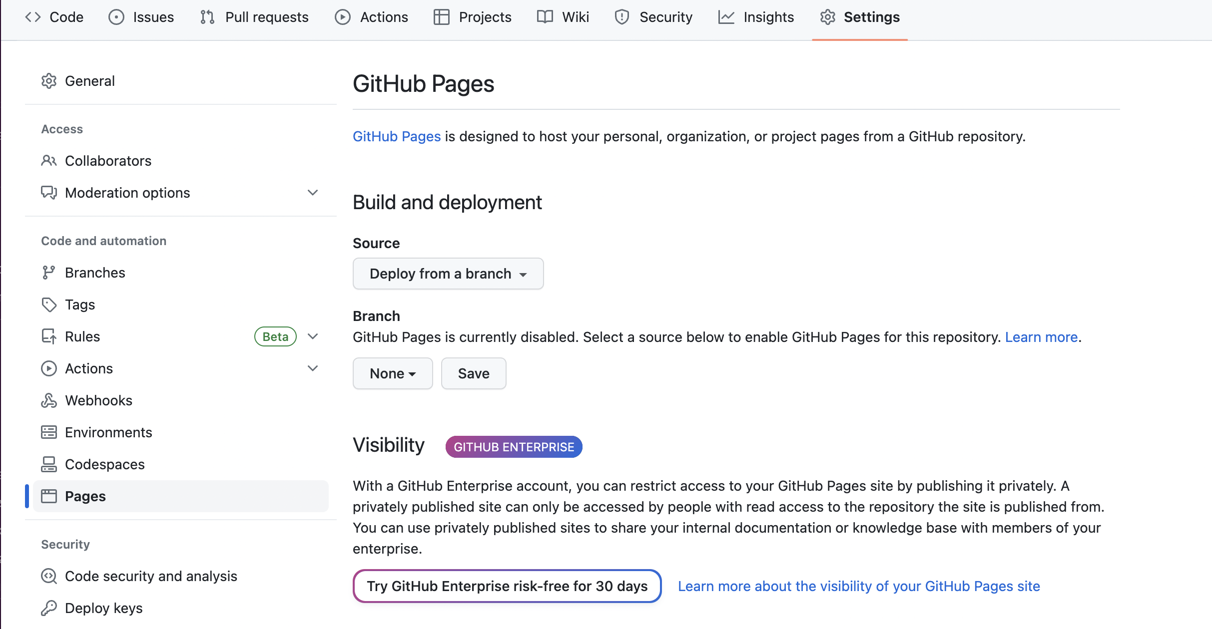 初期表示では「Branch」の項目が「None」に設定されていると思いますので、デフォルトブランチ「master」または「main」に変更して「Save」ボタンをクリックすると下画像の赤枠部分にURLが表示されます。