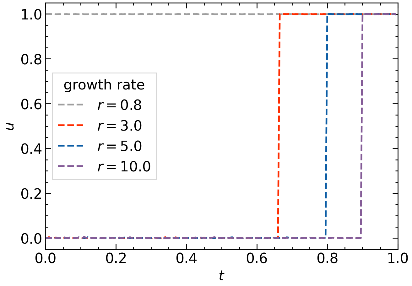 数値計算をしてみると,$u(t)\equiv1$ または階段関数が最適な $u(t)$ になるということがわかります(右下図).$r$の値を変えると,階段関数の立ち上がり時刻 $t$ が変わっています.