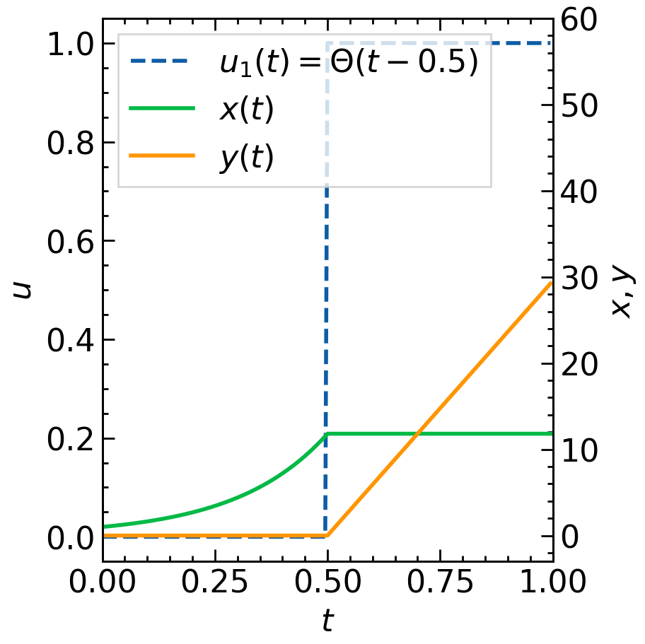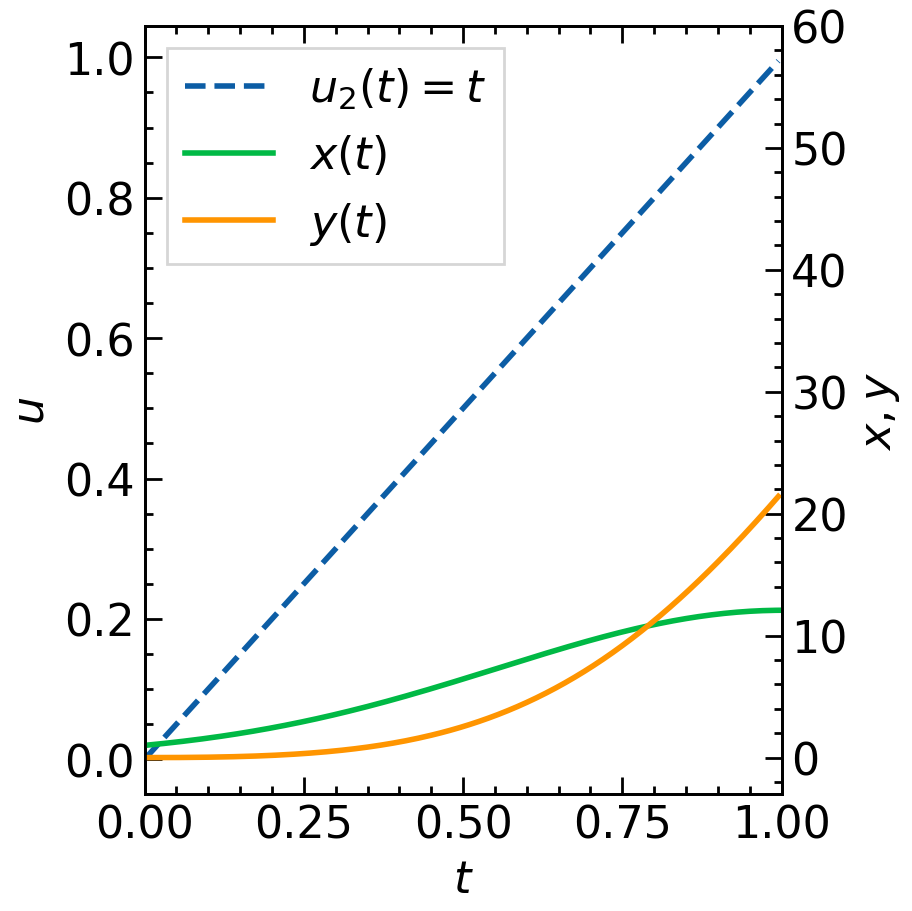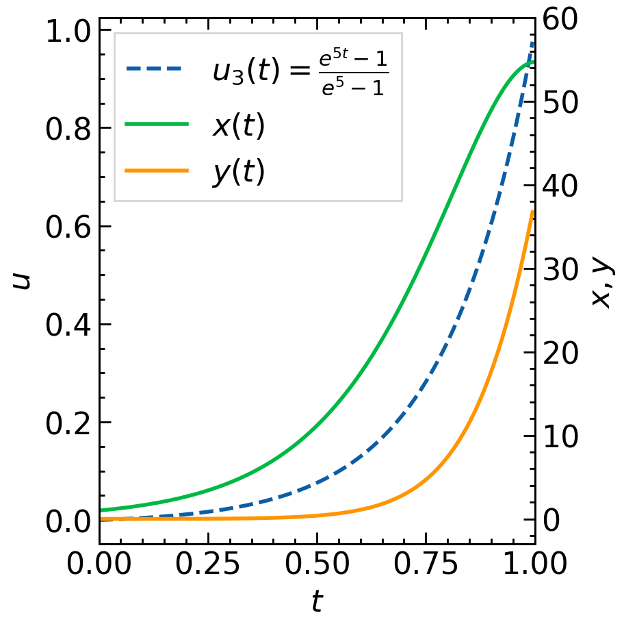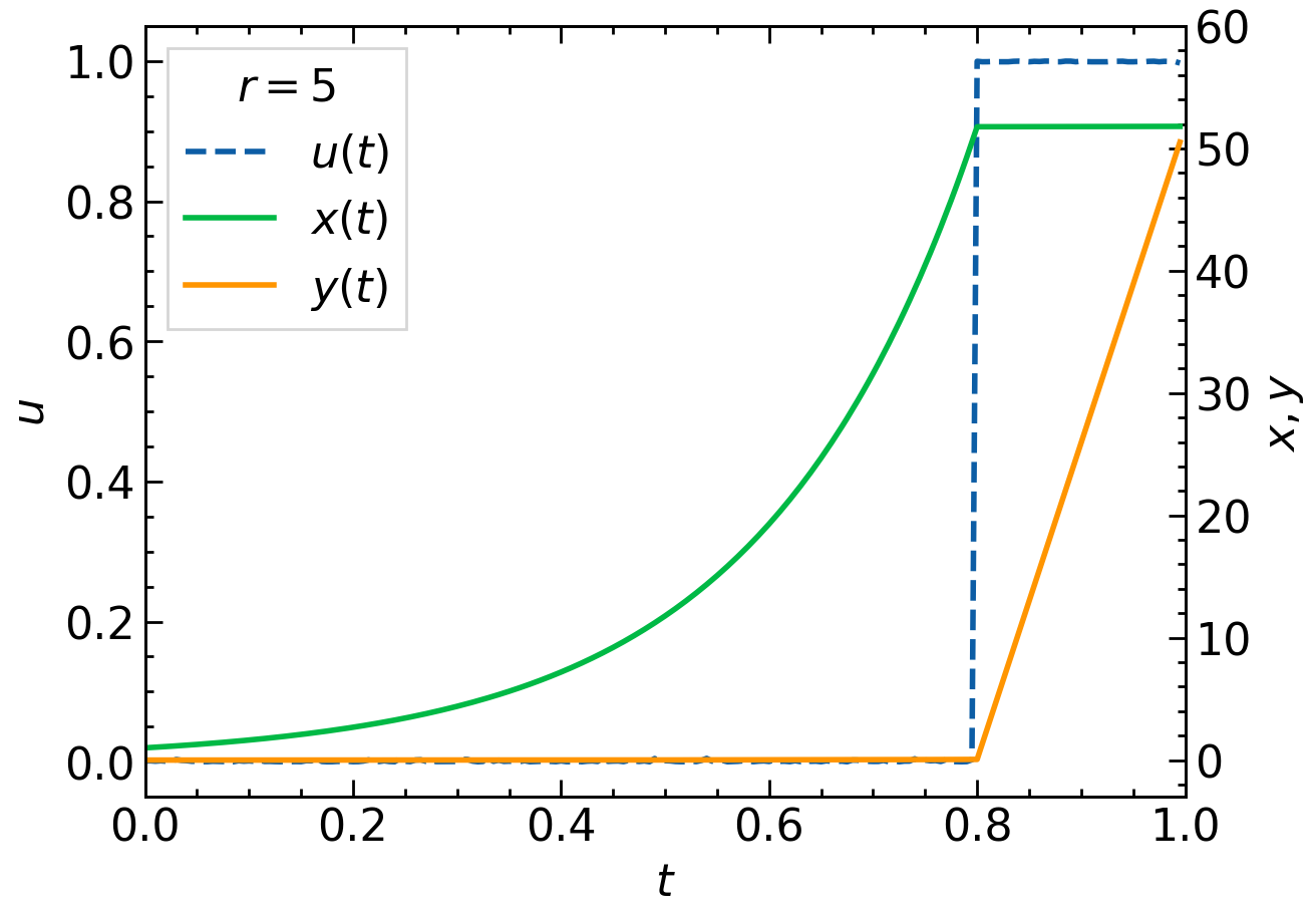 $x(t),y(t)$ にも着目してみましょう.はじめは $u(t)=0$なので,$y(t)=0$ のままで $x(t)$ が指数関数的に増えます.$u(t)=1$ に切り替わると,$x(t)$ の増加が止まり,ここまでで増やすことに成功した $x(t)$ を使って $y(t)$ が線形に増加します.$t=T$ での $x,y$ について $x(T)=y(T)$ が成り立っていることも特徴的です.