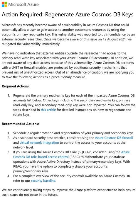 Azure Cosmos DB を活用している 3,300 を超えるユーザーにおいて、Azure Cosmos DB の読み取り/書き込み用プライマリキーが Azure Cosmos DB の Jupyter Notebook 機能の欠陥によって流出し、外部の攻撃者によって、Cosmos DB 内にあるデータの完全読み取り/書き込み/削除が実行可能の状態になっていました。