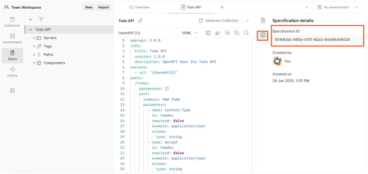 次に、Spec HubにインポートされたOpenAPIのSpec ID (Specification ID)を取得します。右サイドバーの(i)アイコンをクリックすると下記のようなSpecification IDが表示されます。このSpec IDは次の1-2で設定するGitHub Actionの処理で必要になります。