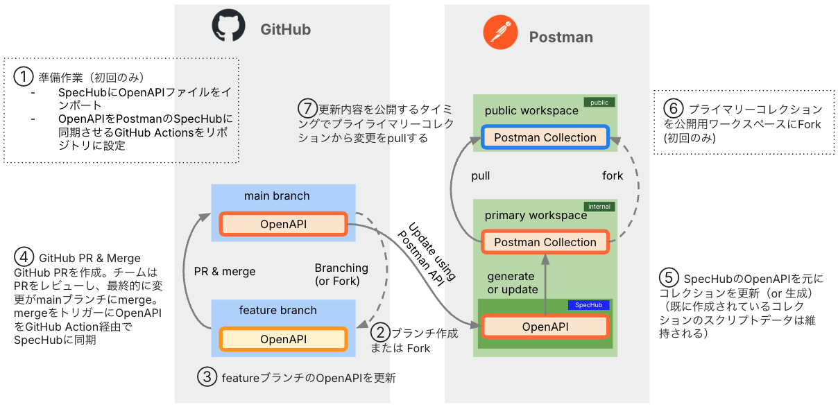 OpenAPIをAPI仕様のマスターとしてGitHubで管理しているプロジェクトにおいて、仕様変更はGitHubのPull Request(以下、PR)を通じて反映し、PostmanのSpec Hubを活用してPostmanコレクションを生成・公開するフローを紹介します。