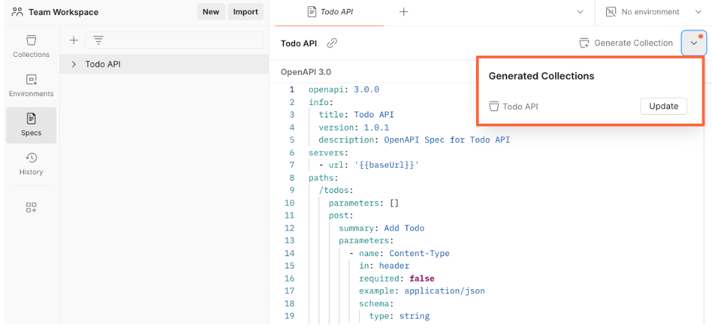 Spec HubのOpenAPIを選択し、右上のGenerate collectionの右隣をクリックすると次のように、このOpenAPIを元に生成されたコレクションが表示されます。ここでは、「1-1. OpenAPIをインポート」時にOpenAPIと一緒に生成されたTodo APIコレクションが表示されています。このコレクション名の隣に表示されているUpdateをクリックします。これで、OpenAPIの変更が該当コレクションに反映されます。