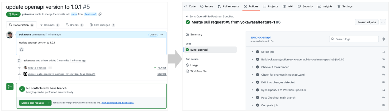 GitHub上でfeature-1→mainブランチのPull Requestを作成します。必要に応じてチームによるPRレビューを実施します。そして、レビューが完了し、PRがmergeされると、Step1で設定したGHAが発動し、OpenAPIを元にSpec HubのOpenAPIが自動更新されます。