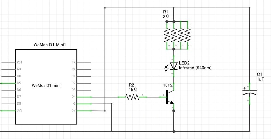 送信装置は秋月の赤外線LED OSI5FU5111C-40 をトランジスタでドライブします。