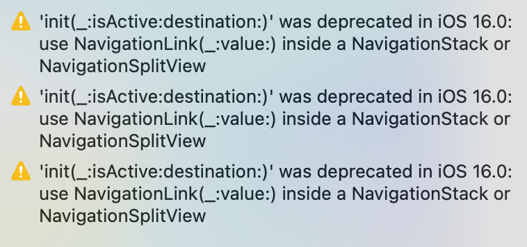 非推奨となったNavigationLinkのinit(_:destination:isActive:)は