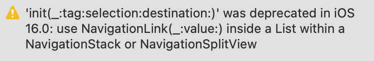 非推奨となったNavigationLinkのinit(destination:tag:selection:label:)は