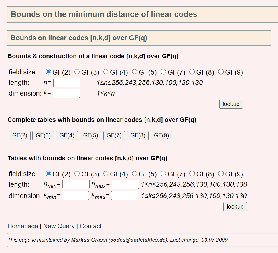 上記のサイトは $n$ 、 $k$ 、 $q$ から登録されている誤り訂正符号のパラメータを検索する構成です。ただし今回は $d=4$ だけ決まっていて他は何でも良いので、 $q$ だけ指定して一覧を表示してみます。