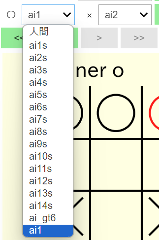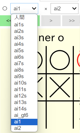 上記の修正後に下記のプログラムを実行すると、実行結果のように 〇 の手番の Dropdown にも ai2 が登録されるようになったことが確認できます。