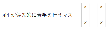 ai4 は、〇 を担当 した場合、必ず 1 回目 で (1, 1) に 着手 を行うので、× を担当 する ai2 または ai3 は、すべて の 着手 で ランダム な 着手 を行います。そのため、ai4 VS ai3 と、ai4 VS ai2 では、× を ai2 が担当 しても、ai3 が担当 しても 全く同じ処理 が行われます。従って、ai4 VS ai2 と ai4 VS ai3 の 対戦成績 は ほぼ同じ になります。