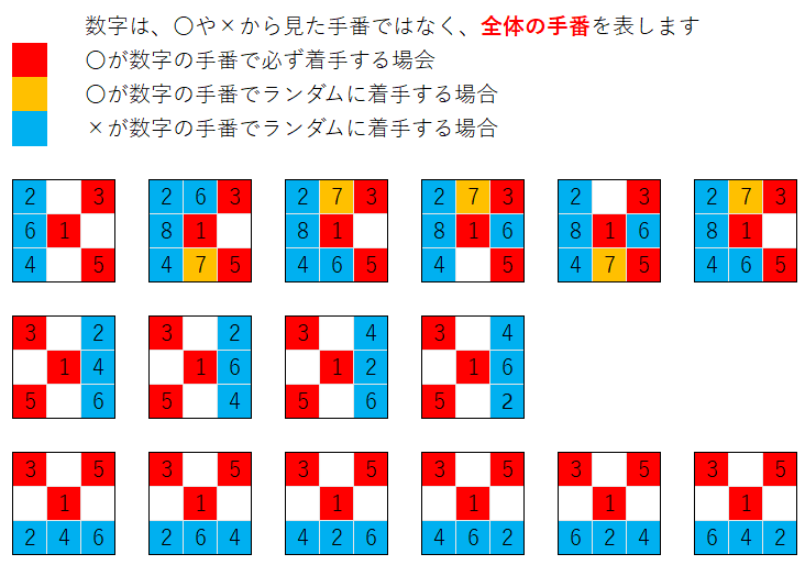 図の 数字 は、全体 の 着手の順番 を表し、赤 が 〇 が 100% その 手番で マスに 着手を行う ことを、オレンジ が 〇 がランダム にその 手番で マスに 着手を行う ことを、青 が × がランダム にその 手番で マスに 着手を行う ことを表します。