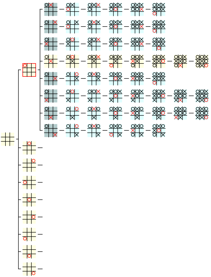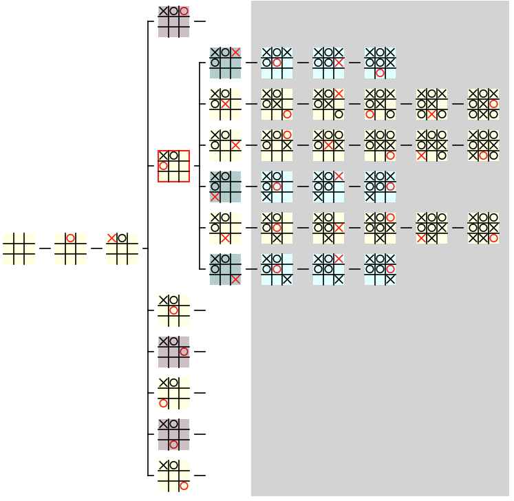 背景が灰色になっている部分のノードは、最善手を着手し続けた場合のノードを表す