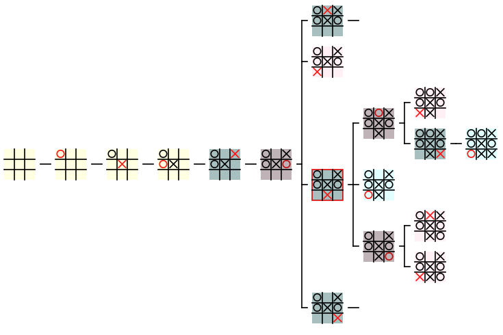 次に、合法手の中の最善手がわかるように GUI の部分木の表示を修正し、合法手を着手した局面から最善手を着手し続けた場合の局面を表示するように修正しました。