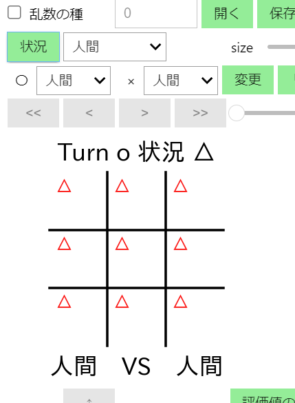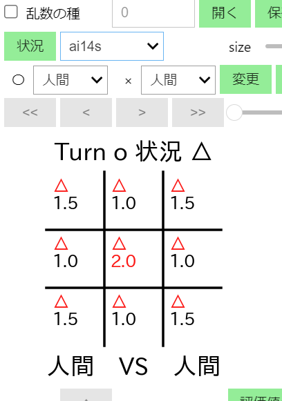 また、Dropdown に ai14s、ai_gt6、人間 を選択した場合は、左から順に下図のようになります。ai14s は真ん中の (1, 1) を候補手としますが、その理由 が評価値が表示されることによって わかりやすくなります。また、この機能を実装したことで、新しく AI を実装した際に、AI が計算した評価値を容易に確認できる ようになるというメリットが得られます。
