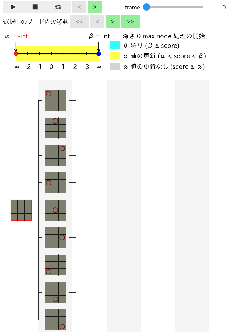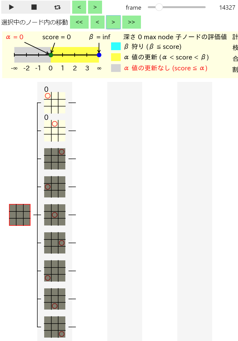 その後 上段の > ボタンを 2 回クリック すると、下図のようにルートノードの 3 番目の子ノードの評価値の計算を開始するフレームに移動できます。