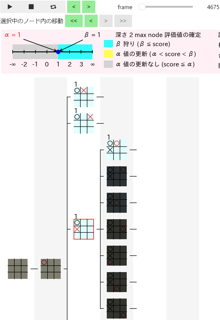 下図左の 4673 フレーム目で >> ボタンをクリック すると、赤枠のノード の 評価値が確定 した下図右の 背景色が薄紫色 の 4675 フレーム目に移動します。