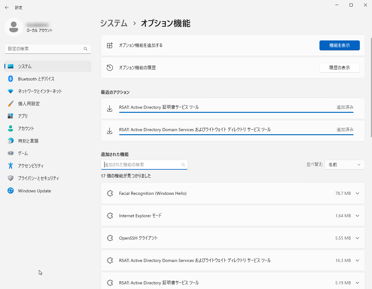 ただし、Windows 10/11等でAD DS認証作業をする場合、前提条件3つ目はモジュールのインストールではなくオプション機能の追加でRSATを追加します。