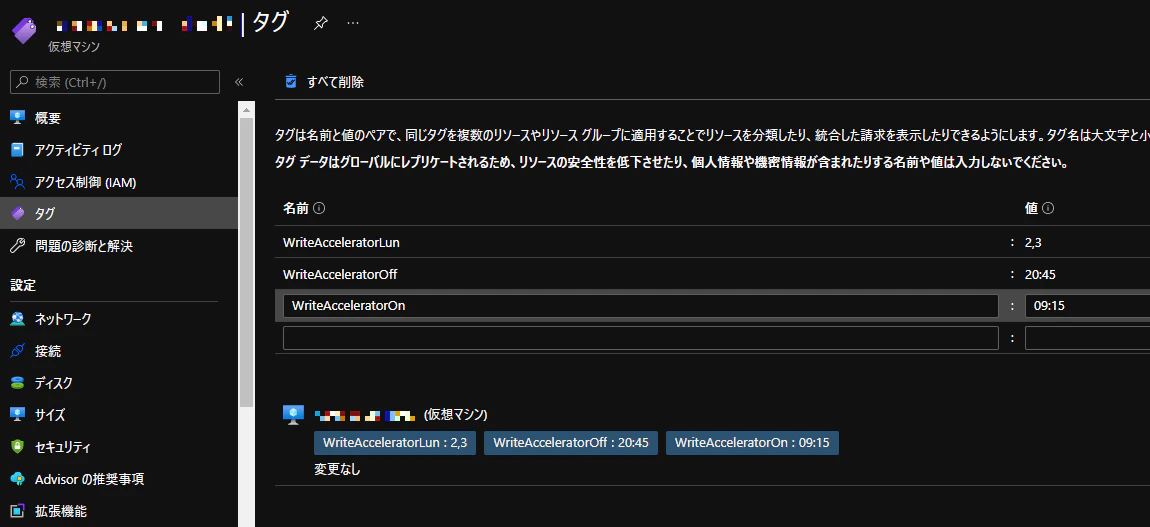 処理を行うVMを特定するため、VMにタグをつけて対象ディスクと設定時刻、解除時刻をそれぞれ設定します。