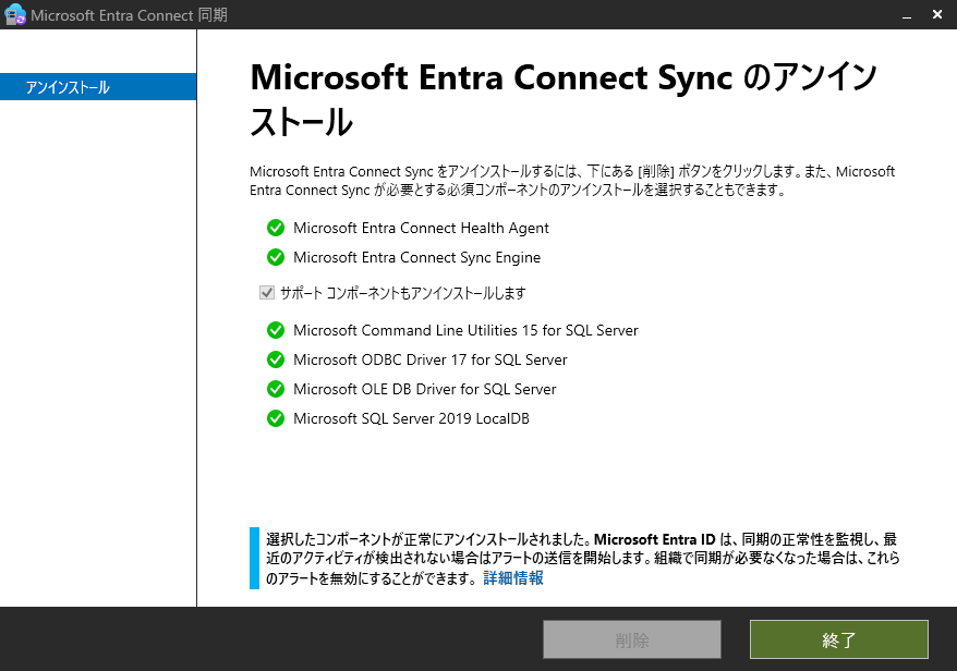 同期が再開されることのないようEntra Connectをアンインストールします。