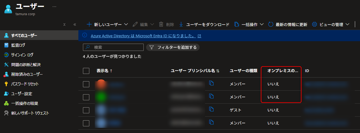 同期されているユーザは「オンプレミスの同期が有効」がはいになっています。