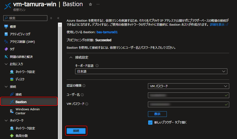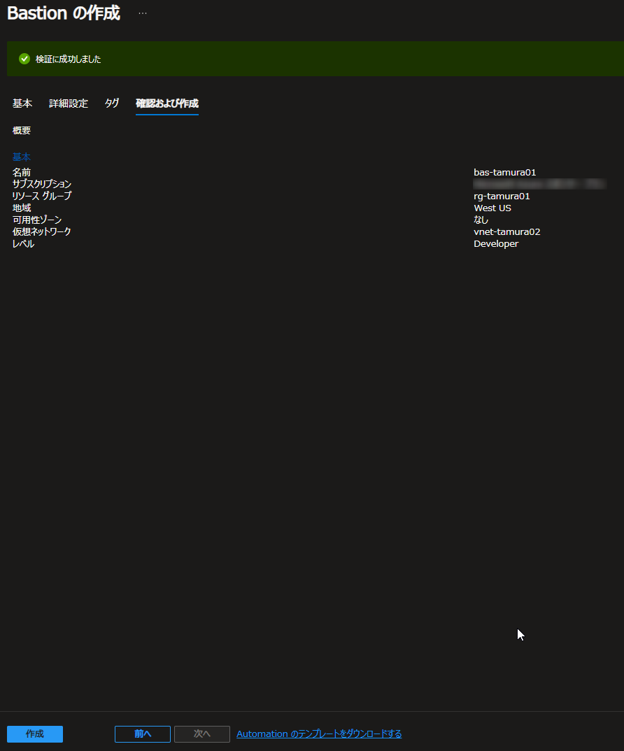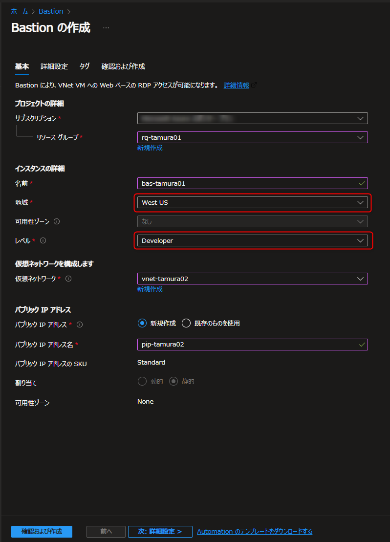 なお、Developer SKUのBastionはVMと同じリージョンにいる必要があるため、VMも上記リージョンで作成しておきます。