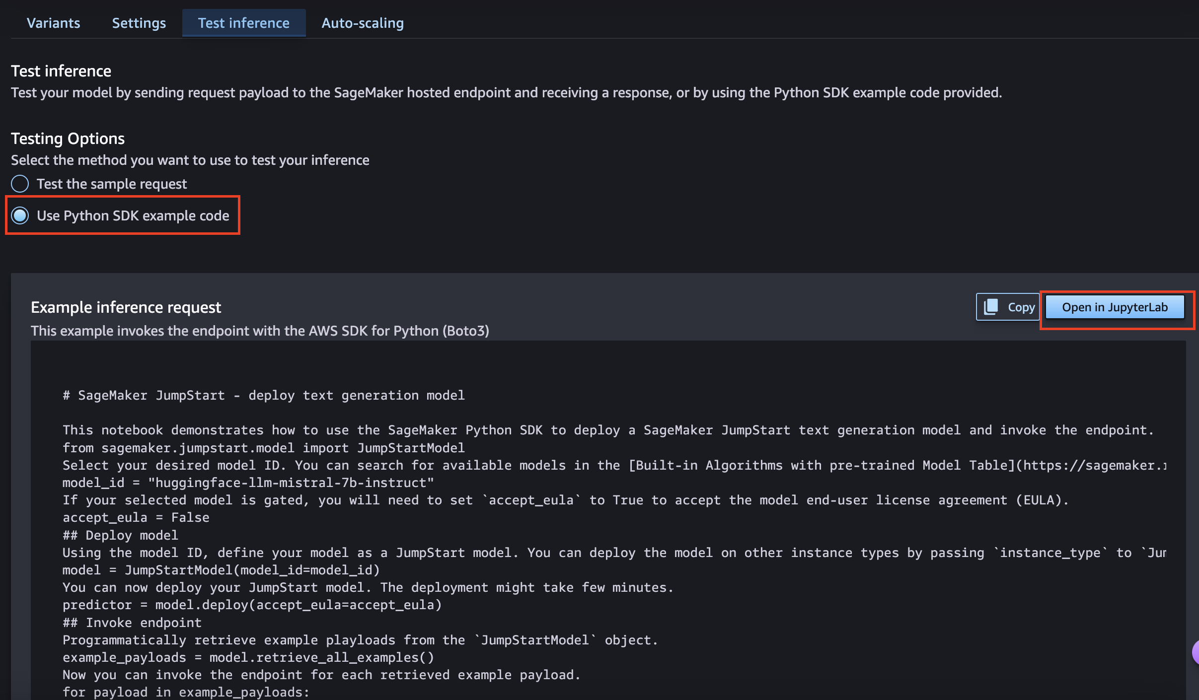 JumpStartではデプロイしたモデルを JupyterLab で動かすことも可能です。今度は「Use Python SDK example code」を選択し、「Open in JupyterLab」を押下します。