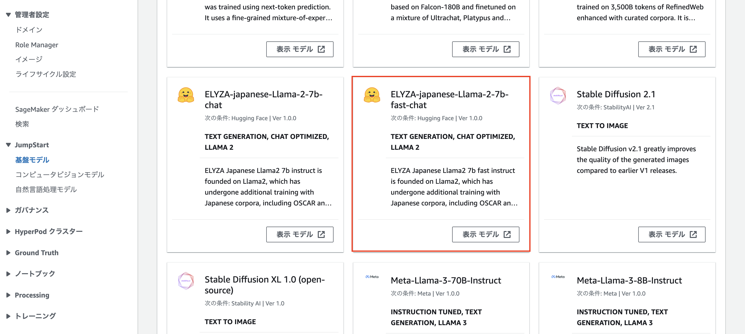「JumpStart」 > 「基盤モデル」を開くと、JumpStartで利用出来るモデル一覧が表示されるので、ELYZAの日本語LLMを探します。今回は ELYZA-japanese-Llama-2-7b-fast-chat を選択しました。
