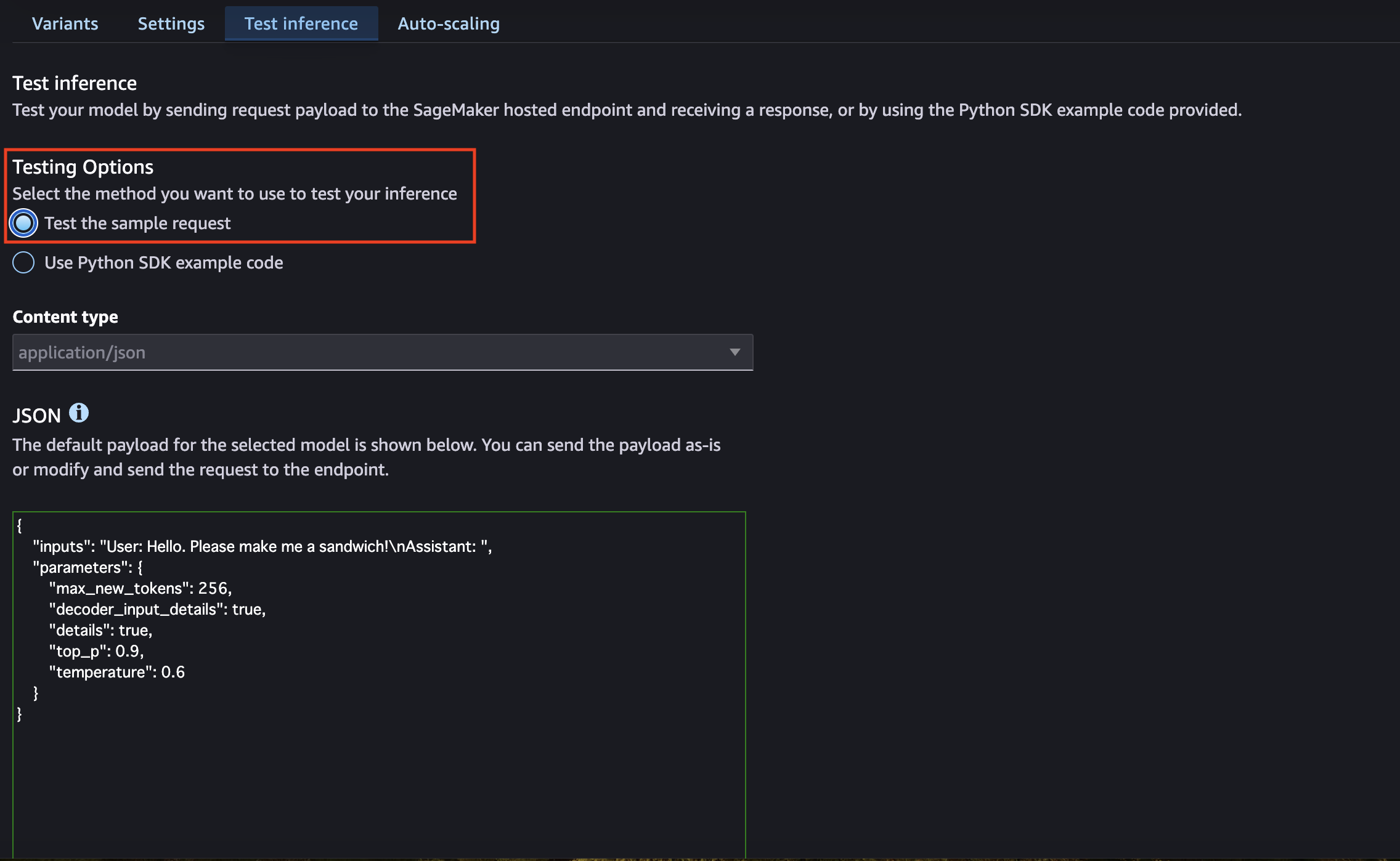モデルがデプロイ出来ましたので、動作確認をしてみたいと思います。エンドポイントの「Test inference」のタブからテスト実行することが出来ます。簡易的なテストであれば、「Test the sample request」を選択します。