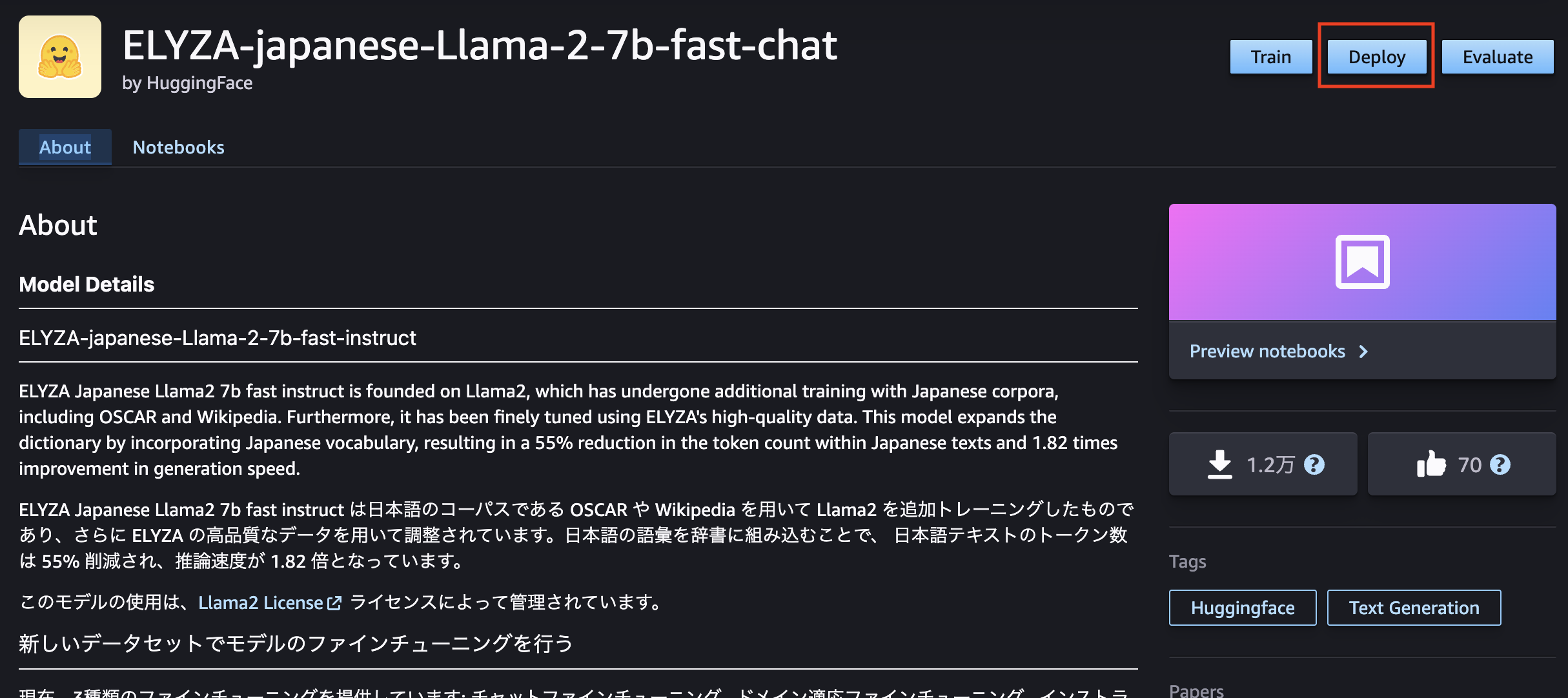 ELYZA-japanese-Llama-2-7b-fast-chat の詳細画面が開きます。ここではモデルについての簡単な説明や利用方法について記載されています。画面右上の「Deploy」からデプロイしてみましょう!