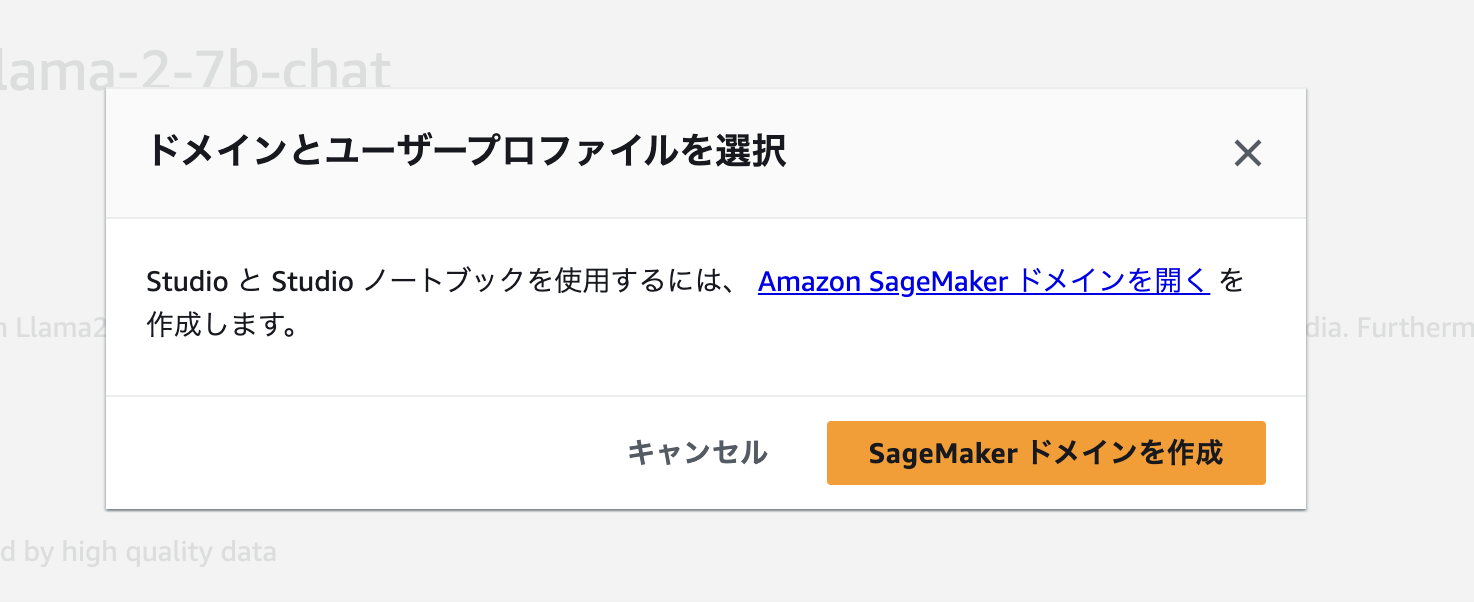 モデルの詳細画面に遷移するので、右上の「Studioでノードブックを開く」を押下します。これで SageMaker Studioが起動するのかと思いきや...