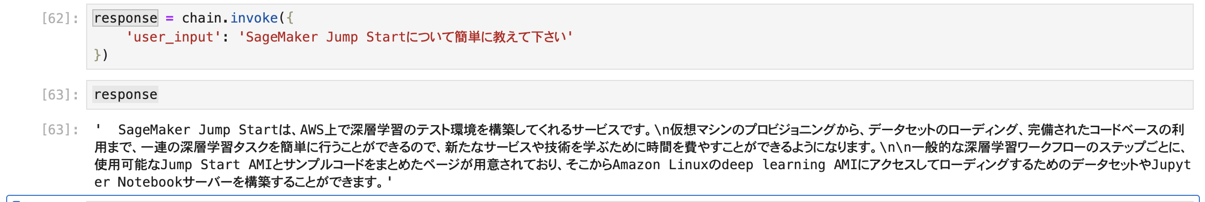 notebook上で以下のようなコードを作成し、実行してみます。記事スペースの都合上詳しい説明は省略しますが、LangChain に SagemakerEndpointというクラスがあるため、今回はこちらを利用してモデルを呼び出すように実装しています。