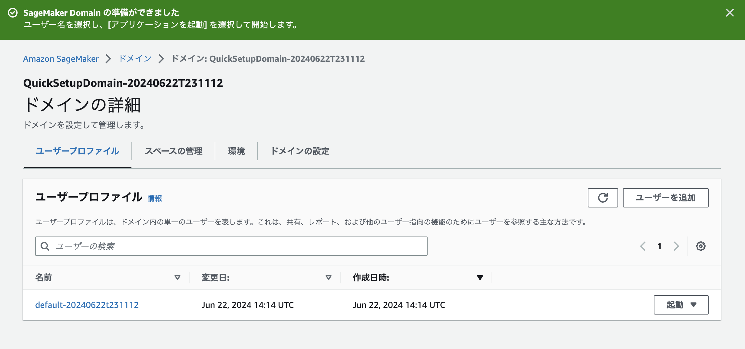 設定が完了し、ドメインとユーザープロファイルが作成されました。画面上部のメッセージの通り、ユーザープロファイル名の右の「起動」からSageMaker Studioを起動します。