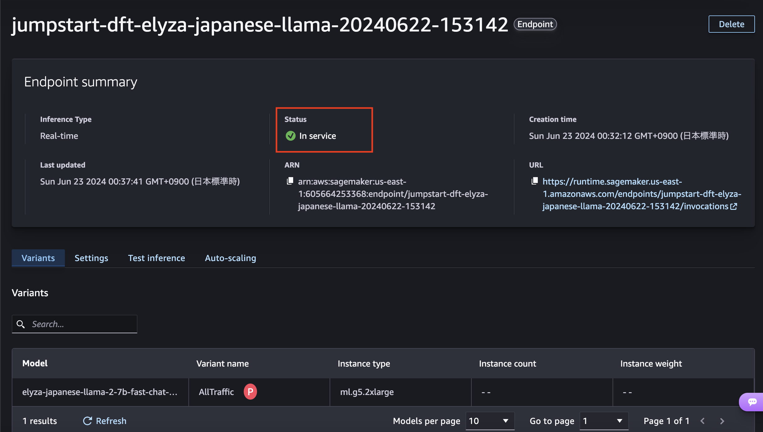 デプロイを開始すると、エンドポイントが作成されます。エンドポイントのStatusが「in Service」になるとデプロイが完了です! とても簡単ですね!