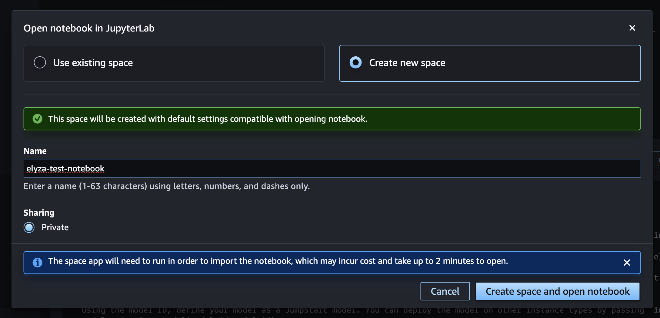 nodebookの作成画面が出ますので、「Create new space」を選択し、新しいnotebookを作成します。
