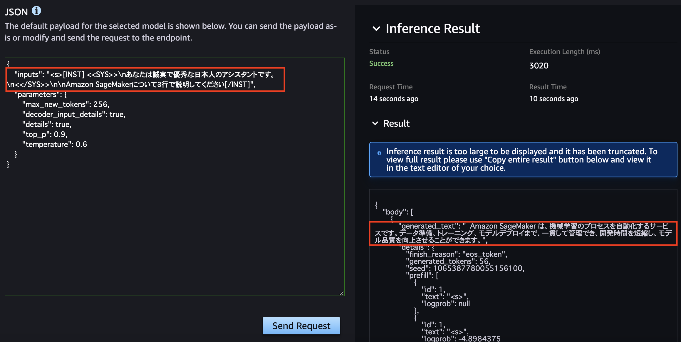 リクエストの "inputs" を書き換えてリクエストを投げてみました。「Amazon SageMaker について3行で説明してください。」と質問しています。実行結果が右側に出ているのですが、質問内容に関して指定通り簡潔に回答してくれており、内容も問題なさそうなことが分かります。