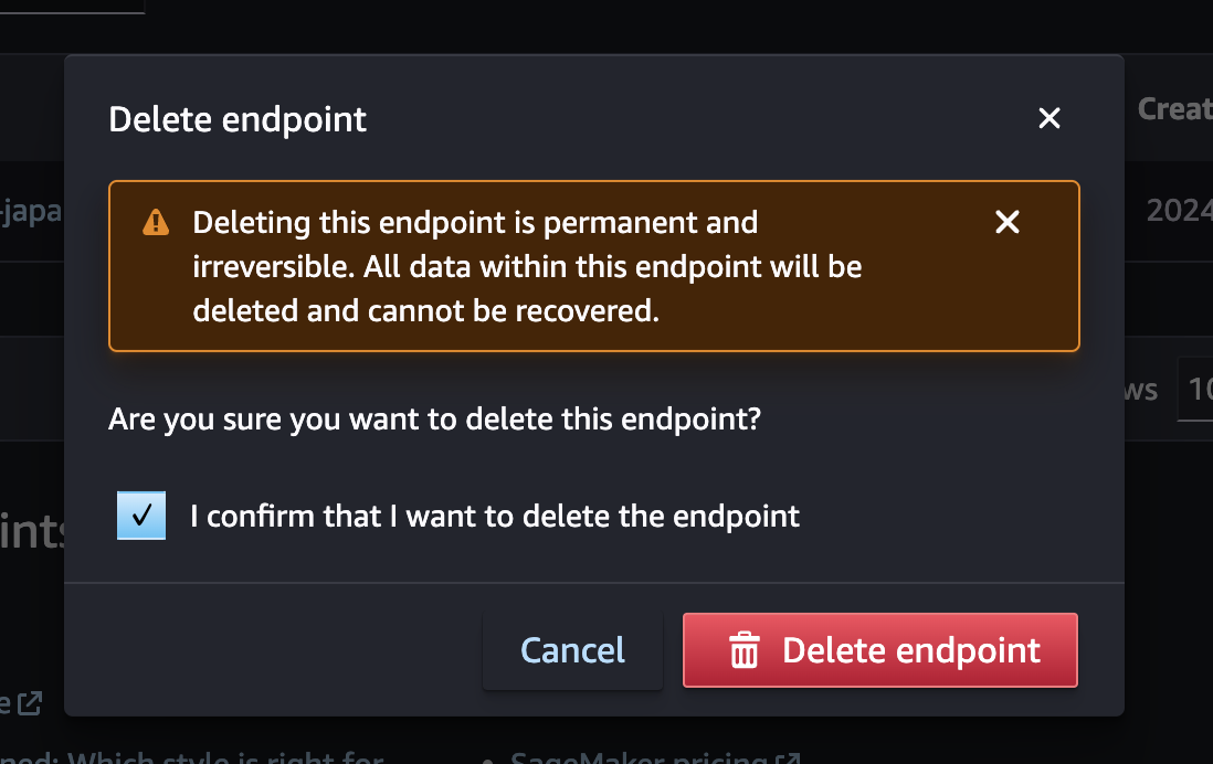 削除確認のダイアログが表示されますので、確認のチェックボックスにチェックを入れ、「Delete endpoint」を押下すると、しばらくするとエンドポイントが削除されます!