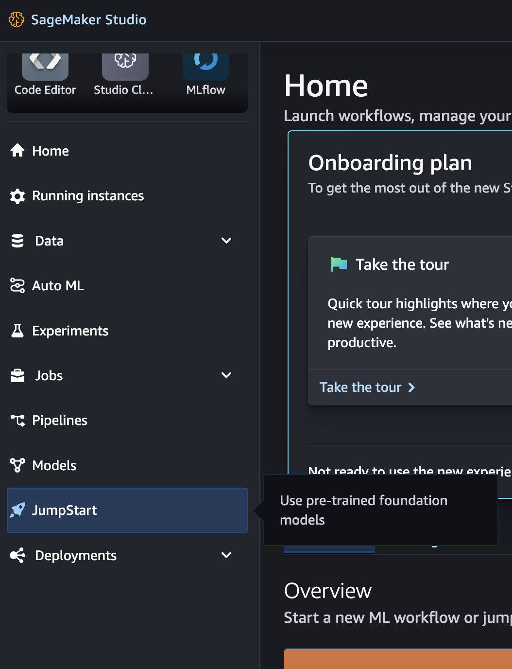 SageMaker Studioを起動出来ましたので、早速モデルのデプロイをしてみたいと思います! Studioのメニューから「JumpStart」を選択します。