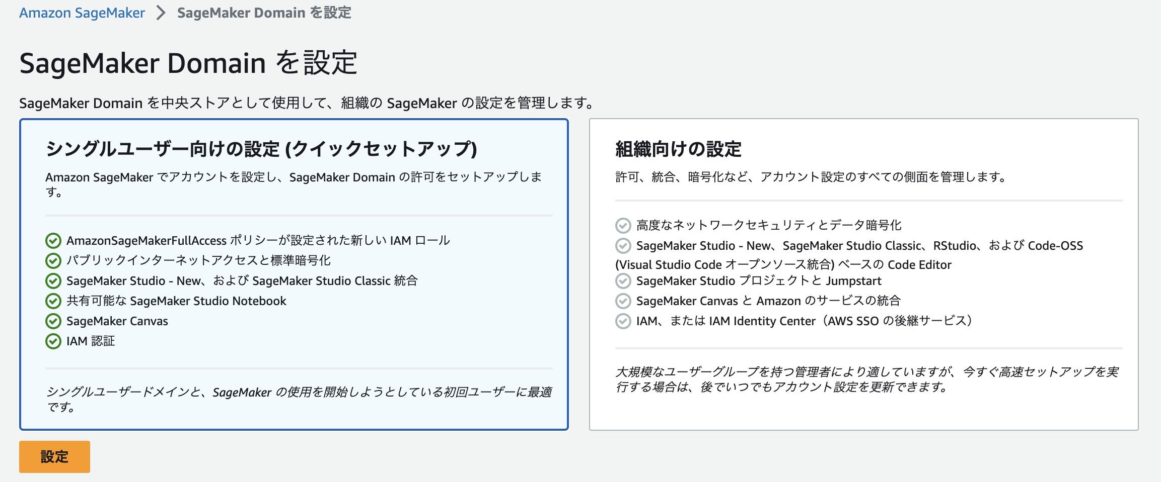 ドメインの設定は「シングルユーザー向けの設定(クイックセットアップ)」で実施します。ドメイン、ユーザープロファイルに加え、IAMロールやStudio Nodebookの作成などを自動で行ってくれます。