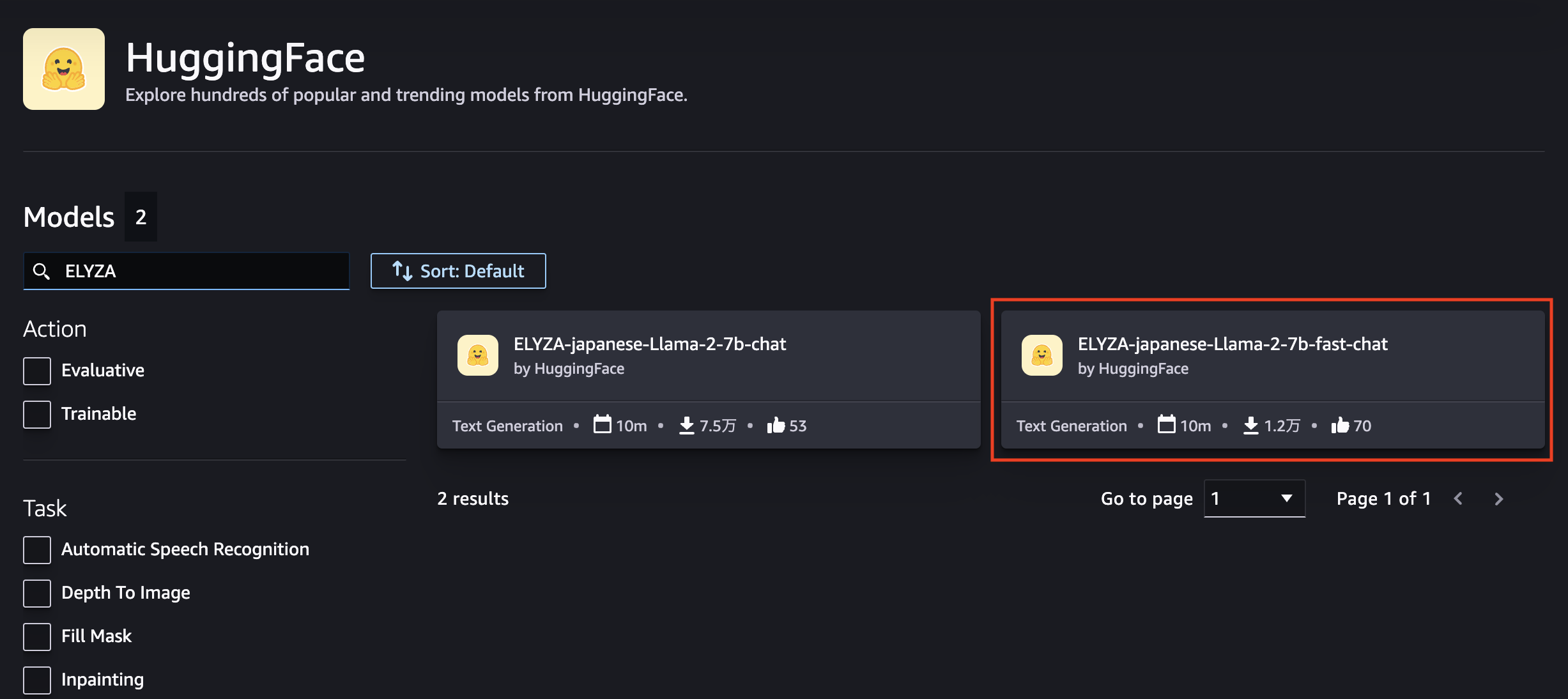 HuggigFaceのモデル一覧から「ELYZA」で検索すると2モデルヒットしますので、今回利用予定の ELYZA-japanese-Llama-2-7b-fast-chat を選択します。