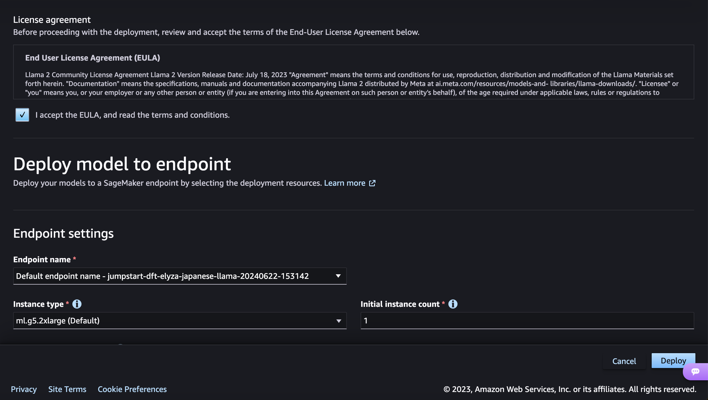 デプロイの設定画面で「I accept the EULA, and read the teams and conditions.」にチェックをつけないとDeployボタンが非活性状態のままなので注意が必要です。その他設定はデフォルトのままデプロイします。