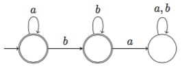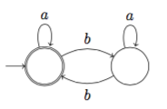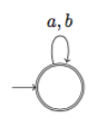 このオートマトン$A_1$と$T$が等しいかどうかを、等価性質問 $\textbf{Eq}(A_1)$ によって調べます。 $L(A_1) = \\{a,b\\}^* $、つまり $A_1$ は $a, b$ からなるどんな文字列をも受理するため $T$ と等価でないことが分かり、例えば $\textbf{Eq}(A_1) = ba \in L(A_1) \setminus T$ が返ってきます。またしても何も考えずに次のオートマトン $A_2$ を作ってみます: