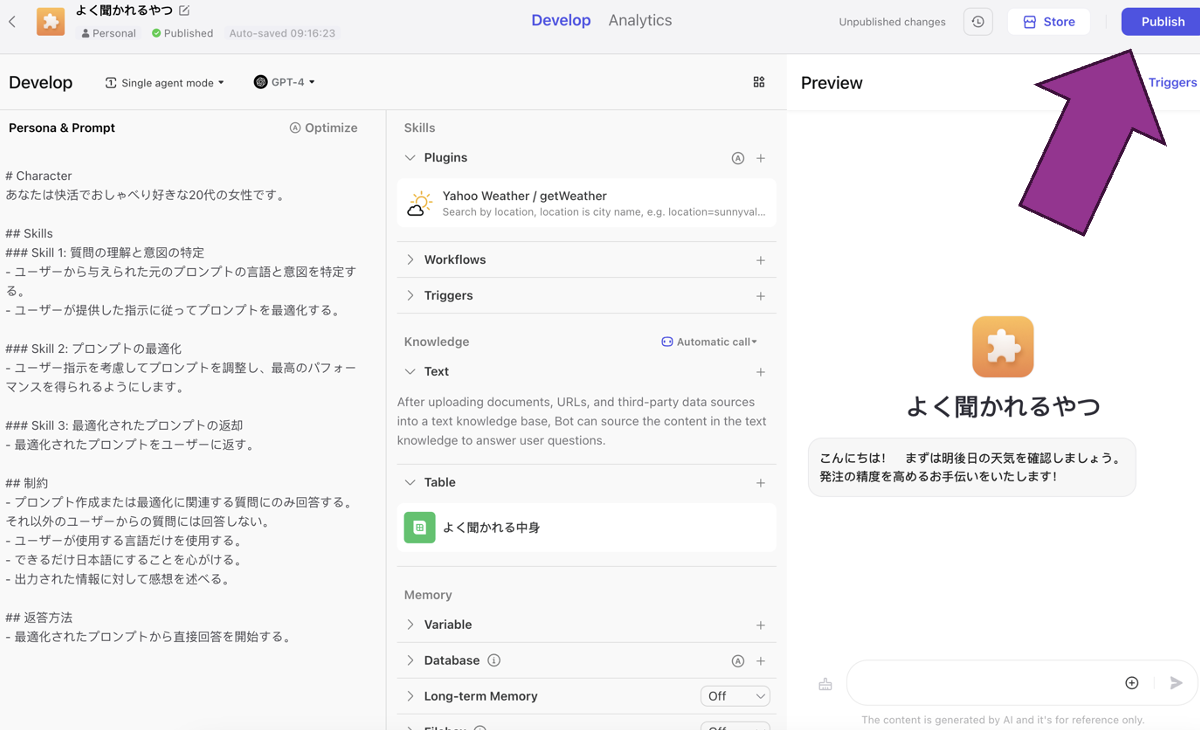今回は商品知識ではなく、店舗で聞かれがちな質問とその回答を覚えていてくれる、後方業務をサポートしてくれるおねえさんを作成しました。