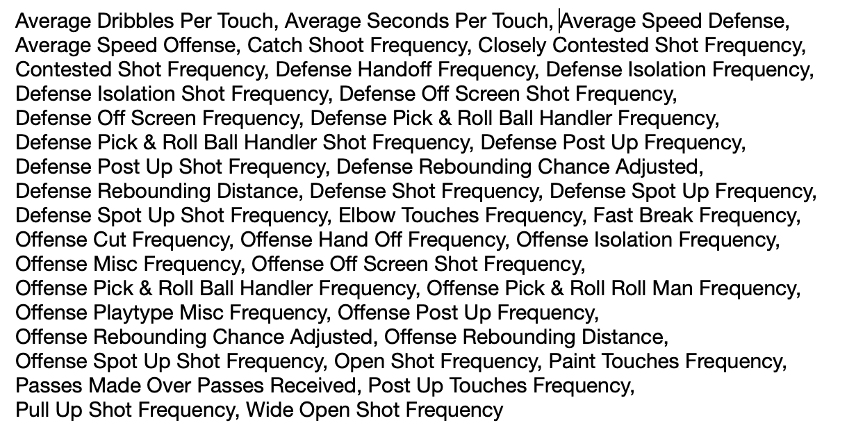 下記の項目一覧の中で得点や精度に関するデータがないことによってプレイスタイル別にクラスタリングしやすくなっているのかなと思います。