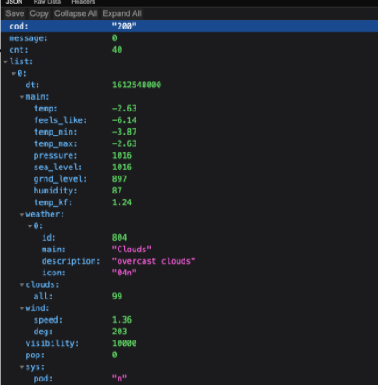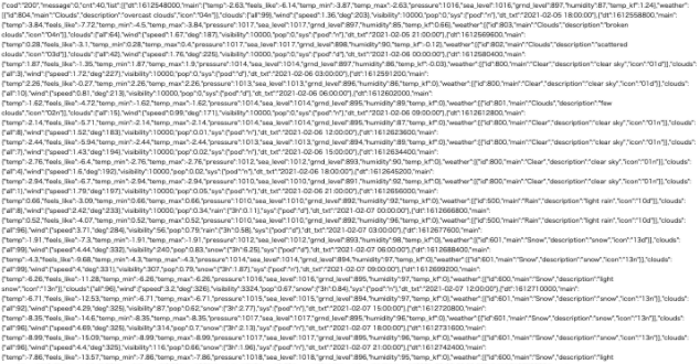 そしてクエリの入力をしたURLをブラウザなどに入れてみると、以下のように現在の天気の情報が表示されると思います。