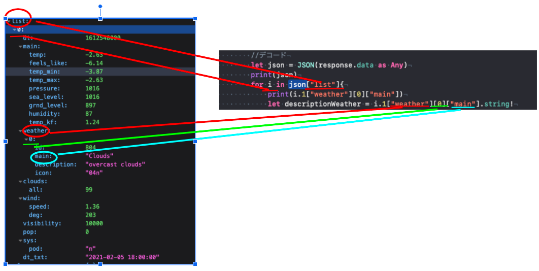 天気だけの情報が欲しい時はjson["weather"][0]["main"].string!のように指定することで値を取得でします。ほんとシンプルでかわかりやすいですよね?