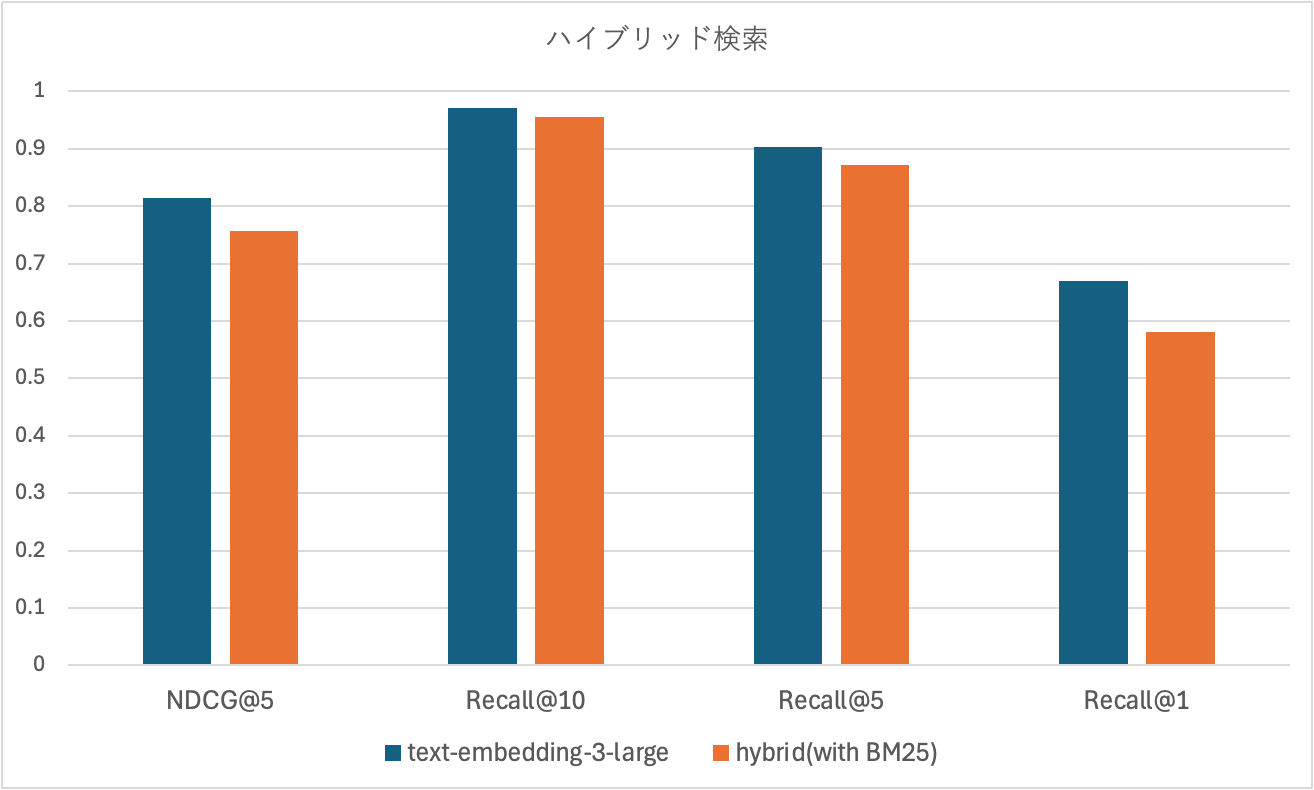 エンベッディングモデルtext-embedding-3-largeのベクター検索のみとBM25とのハイブリッド検索とを比較しました。