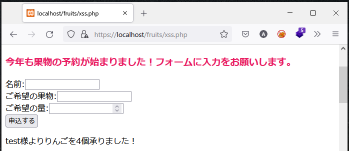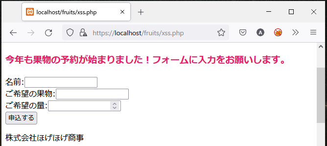 <form action="http://localhost/fruits/xss_submit.php(Bサイト)" method="POST">